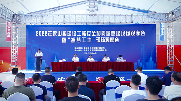 6月23日下午, 2022年象山縣建設工程安全(quán)和(hé)質量管理現場觀摩會暨(jì)“智慧工地”現場觀摩會在草莓丝瓜app视频污建設象山(shān)縣石(shí)浦客運中心工(gōng)程項目部舉行。象山縣委常委、副縣長周堅(jiān)棟,縣政(zhèng)府辦公室副主任蔡振年(nián),縣住建局局長徐穎峰、副局長餘永順及縣相(xiàng)關政府(fǔ)職能部門、各鄉鎮街(jiē)道分管領導出席並(bìng)在主會場現場觀摩,各在象開(kāi)發、監理、施工企業負責人及相關管理人員在各分會場通過視頻觀摩。龍(lóng)元建設集團總(zǒng)裁助理、寧波分(fèn)公司總經理林盛旻出席並在會上發言作經驗交流。